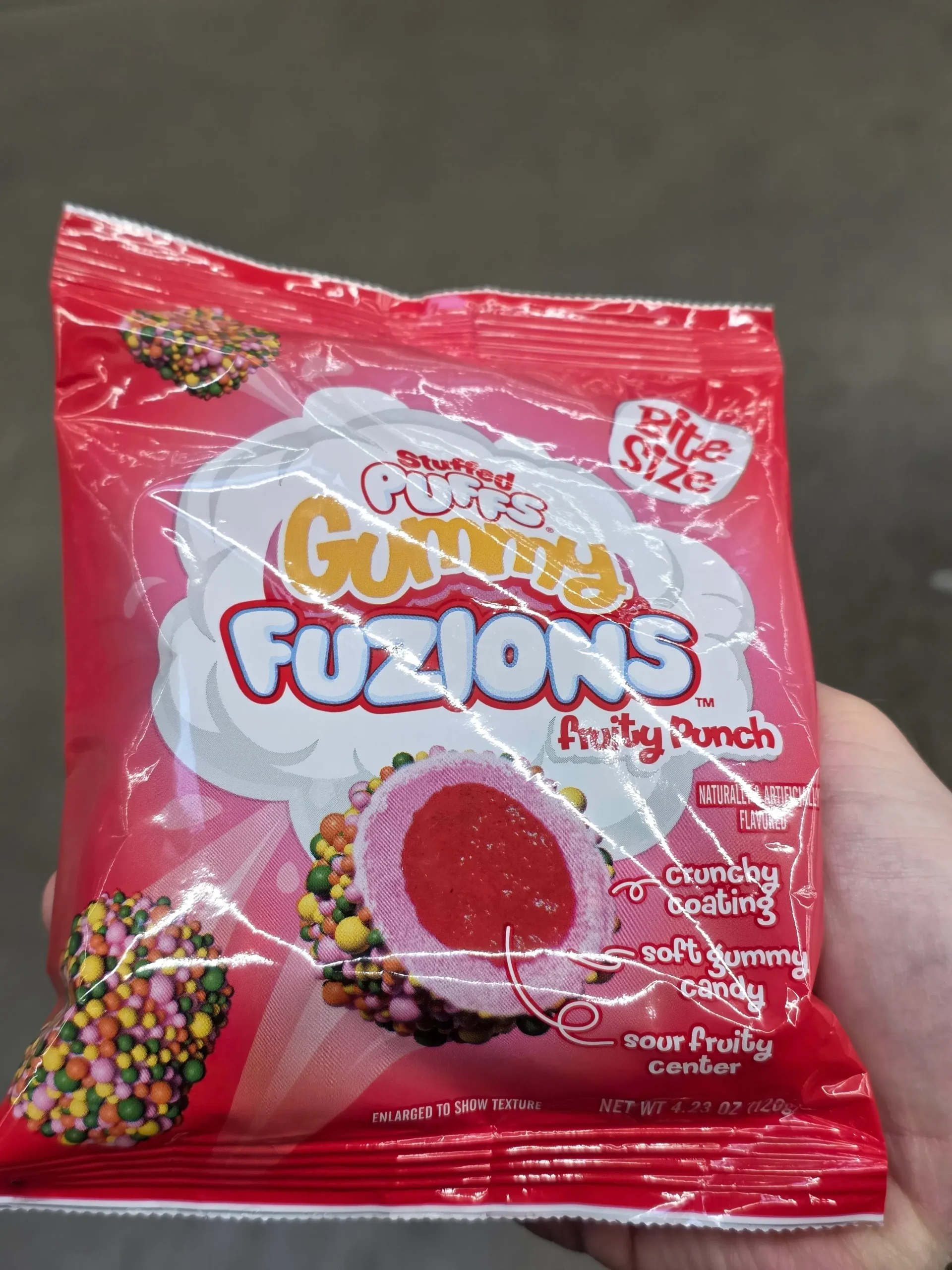 They’re good but could have been so much better, especially compared to the other Fuzions flavors–they’re missing the outside crunchy sprinkles! Instead, these have a light sugary coating on the dense marshmallow and then inside of that, a jelly-like filling.